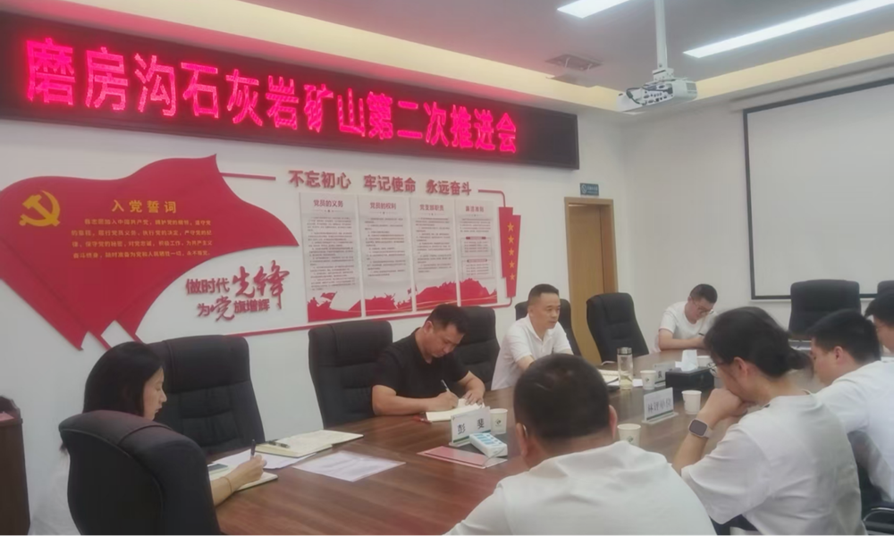 6月25日,公司支部書記、董事長(zhǎng)袁波組織召開磨房溝石灰?guī)r礦山第二次推進(jìn)會(huì)。(素材來(lái)源:業(yè)務(wù)部 彭斐)