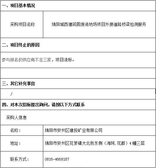 綿陽城西建筑固廢消納場項(xiàng)目外接道路橋梁檢測服務(wù)流標(biāo)公告