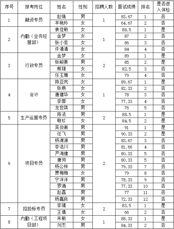 根據(jù)《綿陽安州礦產(chǎn)資源集團有限公司公開招聘(智聯(lián))2022年度工作人員面試工作方案》相關規(guī)定,現(xiàn)將面試成績、排名及是否進入體檢公示如下: